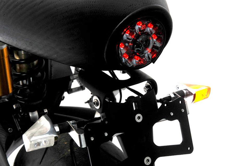 Between the 3.7 gallon carbon fiber tank that is hangs below the oil-holding frame and above the motor, the rear taillight that integrates into the tail section like a Ducati GP9/GP10, and the tasteful use of copper pipes that we liked so much on the Confederate Fighter, there’s plenty to get you drooling on this bike as it borrows from some of the best ideas in motorcycle design.